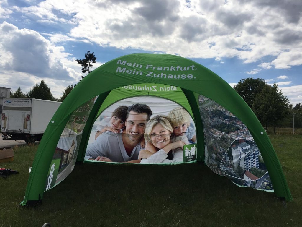 Dank der innovativen Luftkammer-Technologie lassen sich Blow-Up-Zelte in wenigen Minuten mit einer Pumpe aufstellen – ganz ohne Metallgestänge. Die Zelte sind stabil, wetterfest und bieten durch ihre große Druckfläche ideale Möglichkeiten zur Markeninszenierung.
